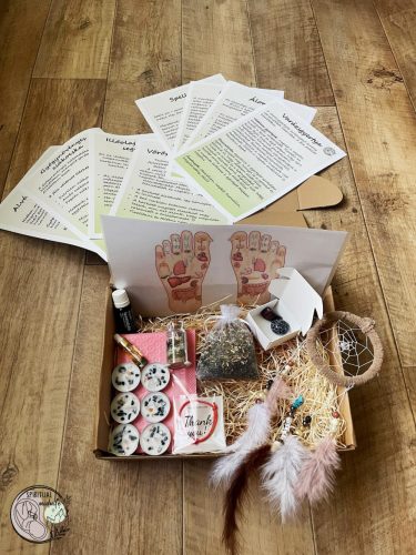 (vörös fonal karkötő, illóolaj keverék a hasfájás ellen egy segédlettel, amelyen megjelölöm, mely reflexpontra kell cseppenteni az általam kevert olajat, alvást segítő gyógynövényes zsákocska, 100%-os levendula olaj, védelem spell jar, 2 db marokkő, használati utasítás, hogy mely termék mire szolgál, hogyan kell használni/tisztítani/tölteni)
