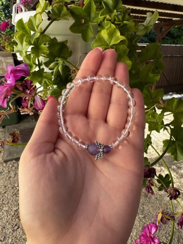 Ez a finom energiájú karkötő a hegyikristály és az ametiszt egyensúlyát hordozza – a tisztaság és a védelem találkozását. A középen elhelyezett apró angyalka emlékeztet arra, hogy sosem vagy egyedül: őrangyalod mindig veled van, és a legnehezebb napokon is támogat, ha figyelsz a jelenlétére.