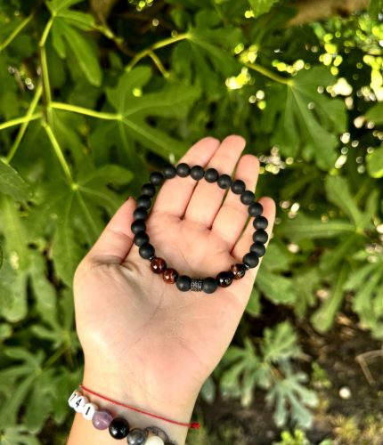 Ez a férfias karkötő három erőteljes ásvány harmóniáját hordozza magában: a lávakő, a macskaszem és az ónix kombinációját. A vulkanikus eredetű lávakő a föld és a tűz energiáját testesíti meg. Ősi erőt, bátorságot és megújulást hoz viselőjének, miközben földelő hatásával segít a stabilitás megteremtésében. A macskaszem különleges fénye mindig a fényt tükrözi vissza a sötétségből, ezért a védelem és a szerencse köveként ismert. Segít, hogy viselője tisztán lássa a helyzeteket, erősíti az intuíciót, és fokozza a magabiztosságot. A mélyfekete ónix a belső erő, a védelem és a kitartás köve, amely megszűri a negatív hatásokat és segít a koncentráció fenntartásában.
