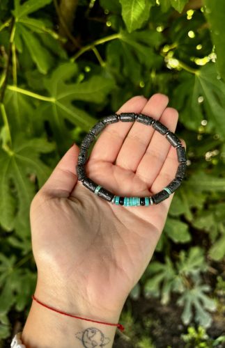 Ez a férfias karkötő a lávakő ősi erejét és a türkiz védelmező energiáját egyesíti. A vulkanikus eredetű lávakő a tűz és a föld elementáris energiáját hordozza, amely segít a belső erő és bátorság felszabadításában. Földelő hatásával stabilitást nyújt, támogatja a kitartást, és erőt ad az újrakezdéshez. A türkiz a védelem és a szerencse köve, amelyet évszázadokon át talizmánként hordtak a harcosok és vándorok. Segít megelőzni a negatív energiák hatását, békét hoz a léleknek, és erősíti az önkifejezést.