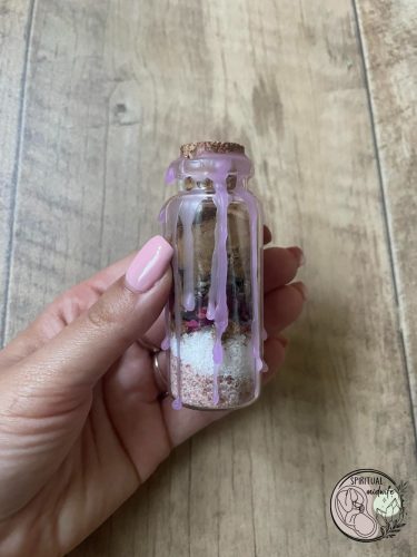 Spell jar = palack varázslatok. A népi mágia egy régi formája. A spell jar-t nem készítheti el bárki; fontos, hogy jártasak legyünk a spiritualitás és a mágia világában. A varázsüvegeket elkészítésük során különböző hatásokkal ruházzuk fel, programozzuk be őket.Hasonló elven működik, mint az ásványok: hinni kell benne és megadatik. Talán közhelyesnek tűnik, de a manifesztáció általában működik. Hacsak nem blokkoljuk a negatív gondolatokkal, túlgondolással, kétségekkel.Elhelyezése: éjjeliszekrényen, fürdőszobában, fésülködő asztalon vagy bárhol ahol jónak érzedHatása: önbizalmat, magabiztosságot ad. Segít elfogadni önmagunkat, hibáinkat, önszeretetre tanít.Méretüknek köszönhetően bárhol könnyedén elhelyezhetők. Érdemes olyan helyet találni nekik, ahol a nap folyamán többször rá tudunk pillantani. Mindig pozitív gondolatokat küldjünk, ha ránézünk.Kortól és nemtől függetlenül bárkinek ajánlom.Elkészítési idő: a rendelés leadásától számítva 5-20 munkanap