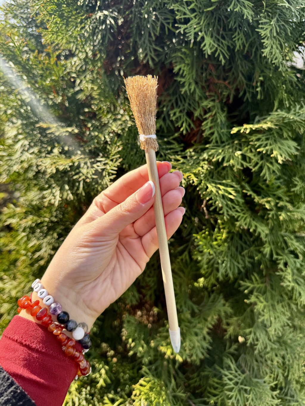 Különleges, boszorkányos eszköz, amely túlmutat egy egyszerű íróeszközön, hiszen minden részlete a tisztítás, a védelem és az erő szimbolikáját hordozza. A seprű ősidők óta a negatív energiák elsöprésének, a tér megtisztításának és az új kezdetek előkészítésének eszköze, így amikor ezzel a ceruzávall írsz, valójában nemcsak szavakat vetesz papírra, hanem tudatosan formálod az energiáidat és a valóságodat is. Különösen erős választás naplózáshoz, árnyékmunkához, manifesztációhoz, rituális íráshoz vagy munkához. A természetes anyaghasználat földelő, stabil energiát ad, miközben a seprű formája folyamatosan emlékeztet arra, hogy képes vagy eltávolítani mindazt, ami lehúz, és visszavenni az irányítást a saját életed felett. Használhatod védelemre is: írhatsz vele sigileket, védelmi köröket, megerősítéseket vagy akár olyan szövegeket, amelyek köréd építenek egy láthatatlan, mégis erős energetikai burkot. Különösen ajánlott akkor, amikor úgy érzed, hogy túl sok külső hatás ér, amikor tisztulásra van szükséged, vagy amikor egy új ciklust szeretnél tudatosan elindítani. Segít abban, hogy ne csak gondolkodj a változáson, hanem konkrét, fizikai cselekvéssé alakítsd azt az íráson keresztül, ami az egyik legerősebb teremtő eszköz. Egy ilyen eszköz a kezedben nemcsak inspirál, hanem emlékeztet arra is, hogy minden leírt szóval egyre közelebb kerülsz ahhoz az élethez, amit valóban élni szeretnél, miközben védelmet és erőt építesz magad köré.