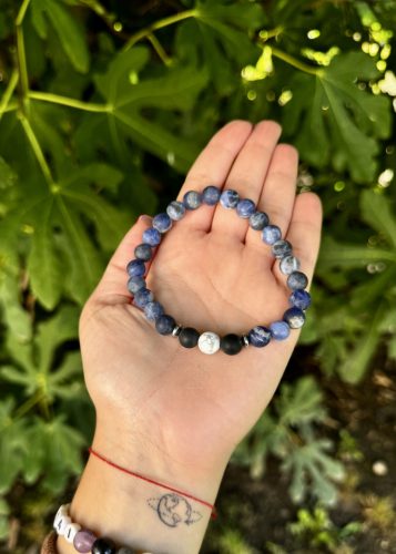 Ez az elegáns férfi karkötő a természet erejét és a belső egyensúlyt ötvözi három különleges ásvány kombinációjával: szodalit, ónix és howlit. A mélyen kék szodalit a bölcsességet, a belső nyugalmat és a tiszta kommunikációt támogatja. Segít letisztázni a gondolatokat, oldja a feszültséget, és erősíti az önbizalmat. Az erőteljes fekete ónix a stabilitás, a védelem és a kitartás köve, amely pajzsként áll a negatív energiák útjába, miközben fokozza a férfias erőt és a koncentrációt. A fehéres howlit a béke és türelem szimbóluma, amely segít lecsillapítani az elmét, enyhíti a belső nyugtalanságot, és támogatja a kiegyensúlyozott mindennapokat.A három ásvány együtt egyensúlyt teremt az erő, a nyugalom és a tudatosság között, így ideális társ mindennapi viselésre, akár a munkahelyen, akár szabadidőben. Letisztult, férfias megjelenésének köszönhetően bármilyen öltözethez illik, legyen az elegáns vagy sportos. A karkötő átlagos, 18–19 cm-es férfi csuklóméretre készült, rugalmas szilikon alapra fűzve, így kényelmesen illeszkedik.Ez a karkötő nem csupán divatos kiegészítő, hanem a belső erő és harmónia mindennapi emlékeztetője is. Ajándéknak is tökéletes választás, hiszen egyszerre sugall stílust, erőt és spirituális támogatást.